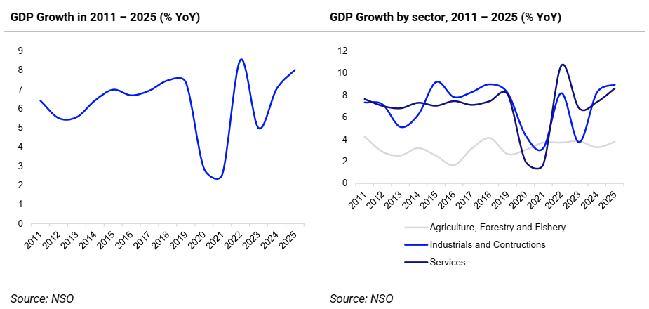 Vietnam concluded 2025 with an impressive GDP growth rate of 8.02% YoY, successfully meeting the National Assembly’s ambitious growth target. This marked the highest level of economic expansion in the past 15 years, excluding the exceptional post-pandemic rebound recorded in 2022 (+8.47% YoY). Over the 2021–2025 period, Vietnam’s economy expanded at an average annual rate of 6.3%, slightly exceeding that of the preceding period (6.2%). Excluding 2021, which was heavily impacted by the Covid-19 pandemic, average growth reached 7.13% per year, surpassing the official target range of 6.5%–7.0%. Economic momentum strengthened notably toward the end of the year, with GDP growth accelerating to 8.46% YoY in Q4 2025. This performance highlights the Government’s more decisive policy implementation in the final stage of the 2021–2025 Socio-Economic Development Plan, reinforcing growth drivers at a critical juncture. These results also underscore Vietnam’s economic resilience in navigating a turbulent global environment, characterized by heightened international uncertainties and intensifying global trade pressures following the introduction of new tariff policies by the United States earlier in the year. Importantly, 2025 represents a pivotal transition year, as a series of structural and institutional reforms were initiated to lay a solid foundation for the 2026–2030 development phase. During this next cycle, Vietnam aims to achieve two-digit GDP growth, progress toward upper-middle-income status, and strengthen its position as one of the leading economies in the region.