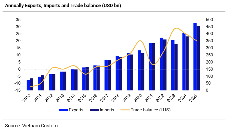 Trade performance emerged as the most notable upside surprise in 2025. Total two-way trade turnover reached USD 930 billion, representing a 18.2% increase YoY and equivalent to approximately 180% of GDP, resulting in a trade surplus of USD 20 billion. This outcome significantly exceeded expectations at the start of the year, particularly in light of challenges stemming from the United States’ implementation of new tariff measures, including a 20% reciprocal tariff applied to Vietnam, which posed considerable headwinds for Vietnamese exporters and global supply chains alike.
