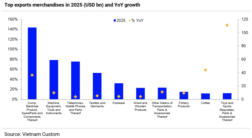 In full-year 2025, exports increased by 17% compared to 2024. The United States remained Vietnam’s largest export market, with total shipments reaching USD 153.1 billion, accounting for 32% of total exports. It was also the fastest-growing market (+28.2% YoY) and the largest contributor to overall export growth. Traditional export categories to the U.S.—including textiles and garments, footwear, wooden furniture, and seafood—continued to demonstrate solid resilience, posting growth rates of 5%–10%. However, the primary growth driver was electronics, which surged by 81% YoY, reflecting Vietnam’s deepening integration into global technology supply chains.