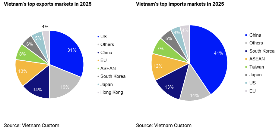 On the import side, imports expanded by 19.4% YoY in 2025, driven mainly by raw materials and intermediate inputs supporting domestic production activities. China remained Vietnam’s largest source of imports, accounting for 40% of total import value, while also posting the strongest growth rate (+29% YoY). In addition, imports from the United States rose sharply (+27.7%), following the establishment of new trade agreements. Overall, Vietnam demonstrated strong resilience against renewed trade pressures while further reinforcing its position within global value chains.