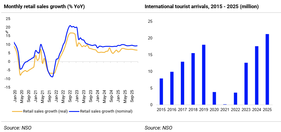 International tourism posted a record performance, with 21.2 million international arrivals in 2025, representing a 20.4% YoY increase. This strong rebound in inbound tourism also translated into a sharp acceleration in services exports, which rose by 18.9% compared to 2024.