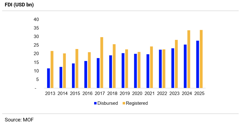 Foreign direct investment (FDI) disbursement also maintained steady growth, reaching USD 27.62 billion, up 9% YoY. However, newly registered FDI moderated, rising by only 0.5% compared to 2024, reflecting a more cautious investment sentiment amid heightened global uncertainties.