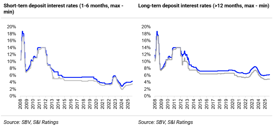 Following significant rate cuts implemented since 2024, interest rates in 2025 were maintained at low levels to continue supporting economic growth. Long-term deposit rates (tenors above 12 months) remained within the 5%–6% per annum range, while short-term rates fluctuated between 3% and 4% per annum.