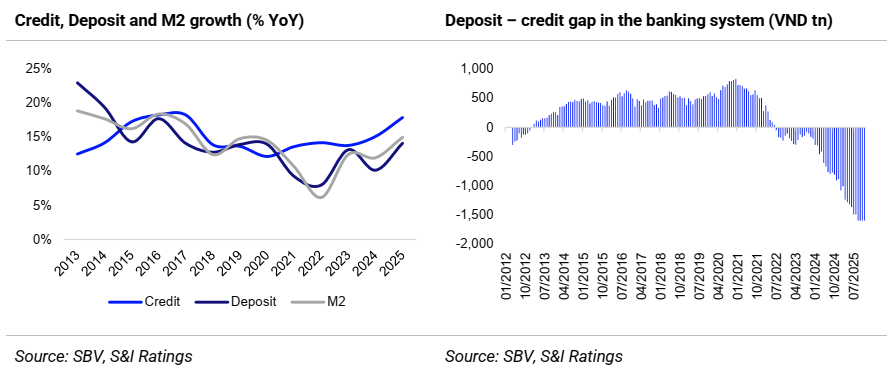 Credit growth exceeding deposit mobilization has continued to widen the gap between funding and lending, thereby exerting increasing pressure on system liquidity. By end-2025, total outstanding credit stood at VND 18.4 quadrillion, compared to VND 16.8 quadrillion in total deposits, resulting in a funding gap of nearly VND 1.6 quadrillion.